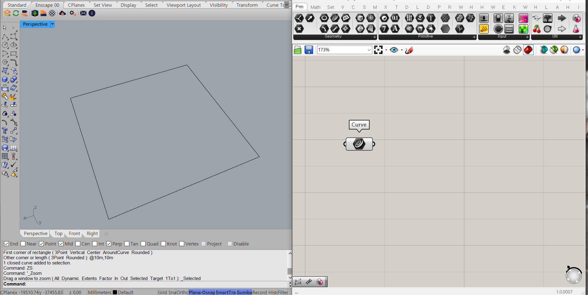 먼저 라이노에서 임의로 하나의 닫힌 커브를 만들어요. 저는 10m x 10m의 정사각형 커브를 만들었어요. 그 후 그래스호퍼에서 Curve 컴포넌트를 불러와 우클릭 한 뒤 set one curve를 눌러 연결해주면 돼요. 지금은 하나의 커브를 수동으로 연결했지만, 나중엔 수많은 커브를 불러올거고, 그 과정도 자동으로 할 거예요.