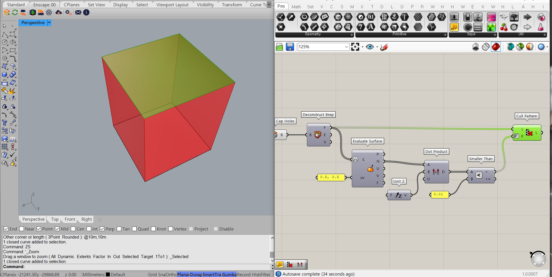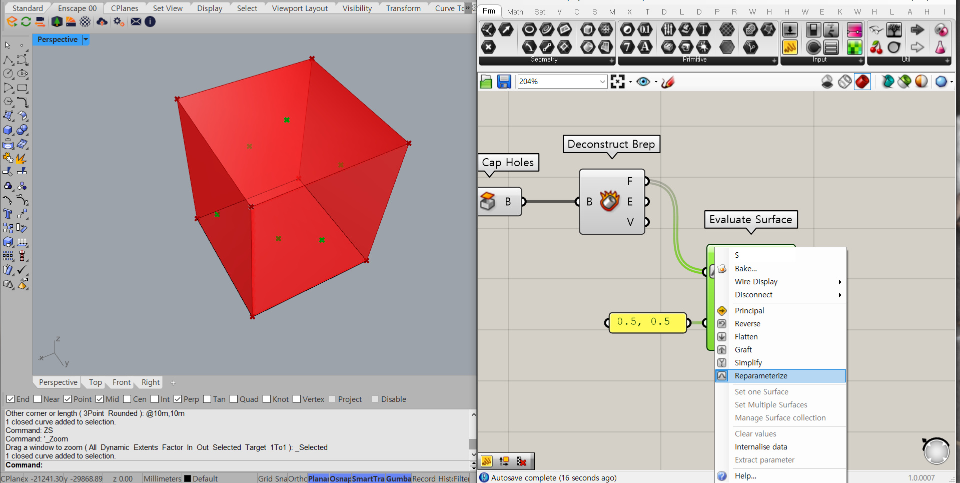 Cap Holes를 Deconstruct Brep 컴포넌트에 연결해줘요. Deconstruct Brep은 객체의 면, 모서리, 꼭짓점을 분해해줘요. 우리는 이들 중 면을 이용할 거예요. 면 중에서도 가장 위에 있는 면만 이용할 거예요. 옥상에 파라펫을 만들 거기 때문이에요. Evaluate Surface 컴포넌트에 Deconstruct Brep의 F(면)를 연결해줘요. 이때 중요한 건 Evaluate Surface의 연결한 곳을 우클릭 하고 Reparameterize를 해줘야 해요. 그리고 " 를 쳐서 패널을 불러온 다음 더블클릭 하여 0.5, 0.5를 입력해줘요. 그걸 Evaluate Surface의 두번째에 연결해줘요.