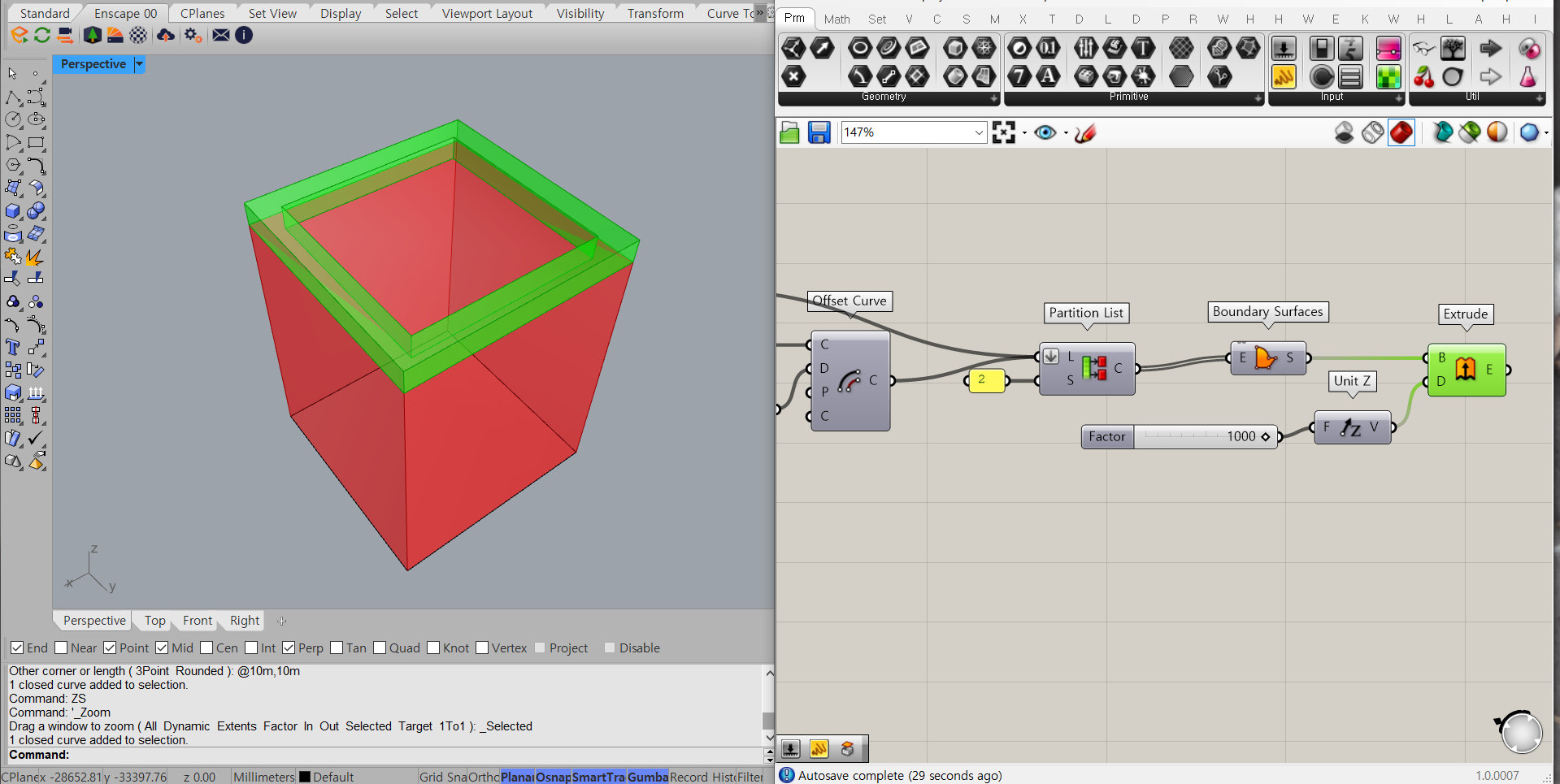 Partition List를 Boundary Surfaces 컴포넌트에 연결해줘요. Boundary Surfaces 컴포넌트는 라이노의 PlanarSrf와 동일한 기능을 해요. 이제 Boundary Surface를 Extrude 컴포넌트에 연결해요. 그리고 역시 방향과 크기를 지정하는 D에는 Unit Z에 1000을 꽂은 채 연결해줘요. extrude를 눌러보면 파라펫이 만들어진 걸 볼 수 있어요.
