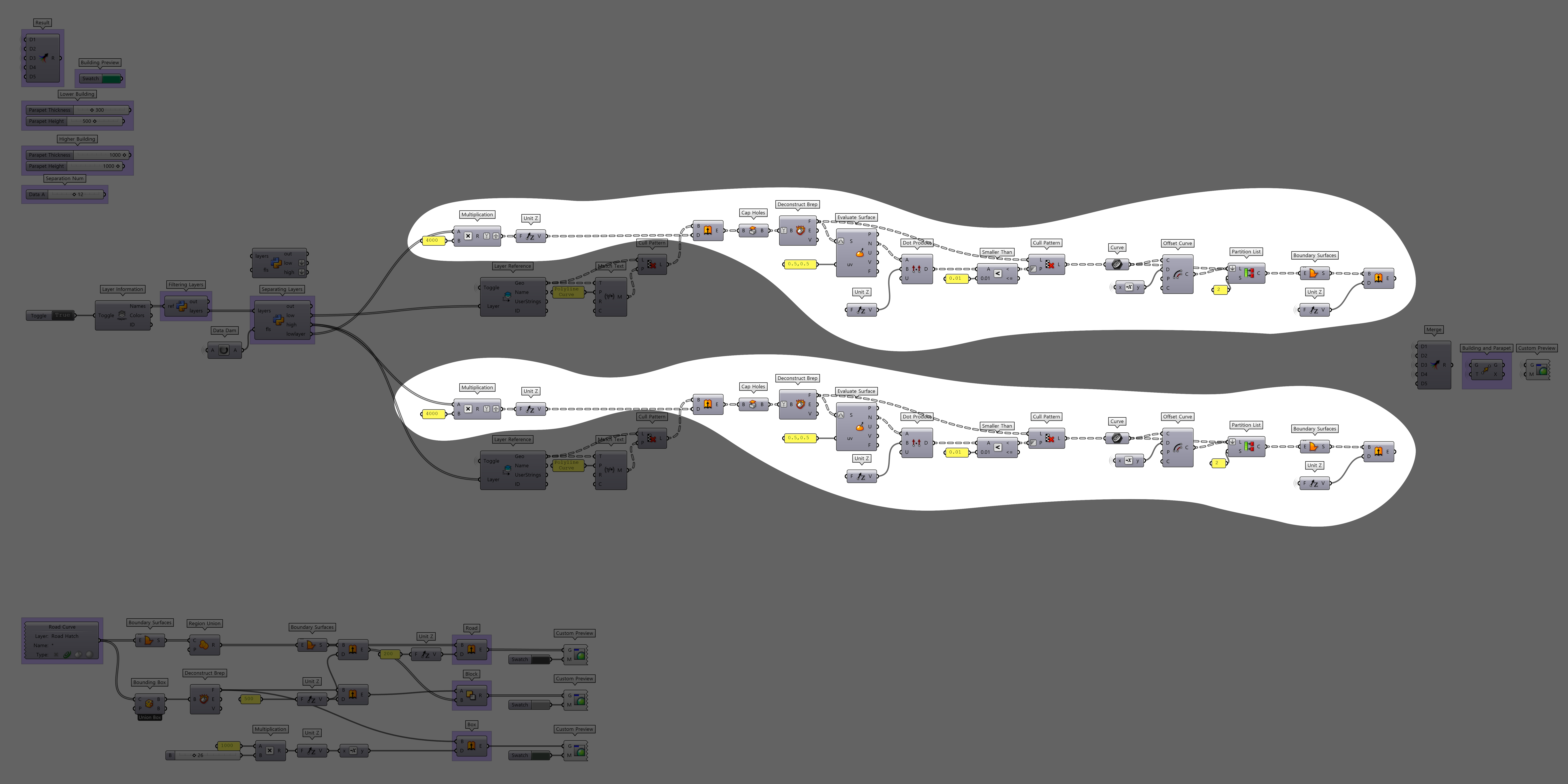 오늘 만든 전체 코드예요. 건물의 매스를 올리고, 파라펫을 올려봤어요. 숫자를 입력한 부분이 군데군데 있었는데, 패널을 통해 입력한 건 상수라서 바꾸면 안돼요. 하지만 넘버 슬라이더로 입력한 부분들은 원하는대로 바꿀 수 있어요.