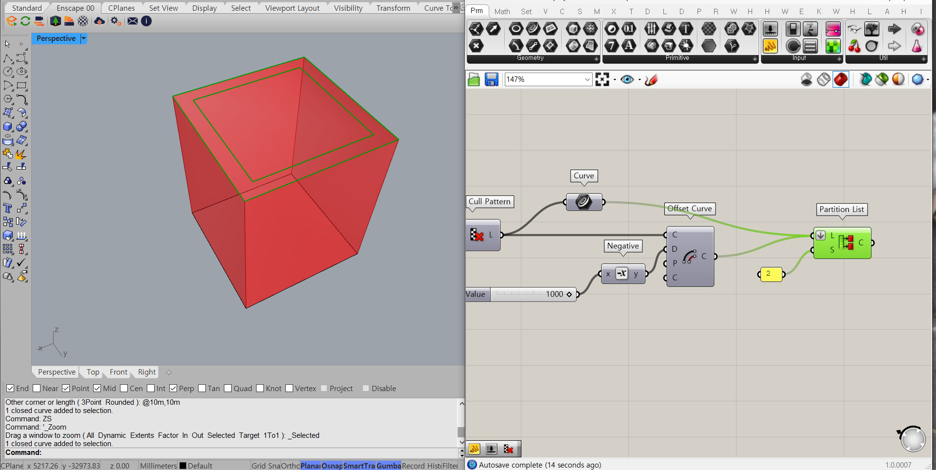 Curve 컴포넌트와 Offset Curve 컴포넌트를 함께 눌러보면 두 개의 커브를 볼 수 있어요. 이걸 이제 Extrude 시켜주면 돼요.