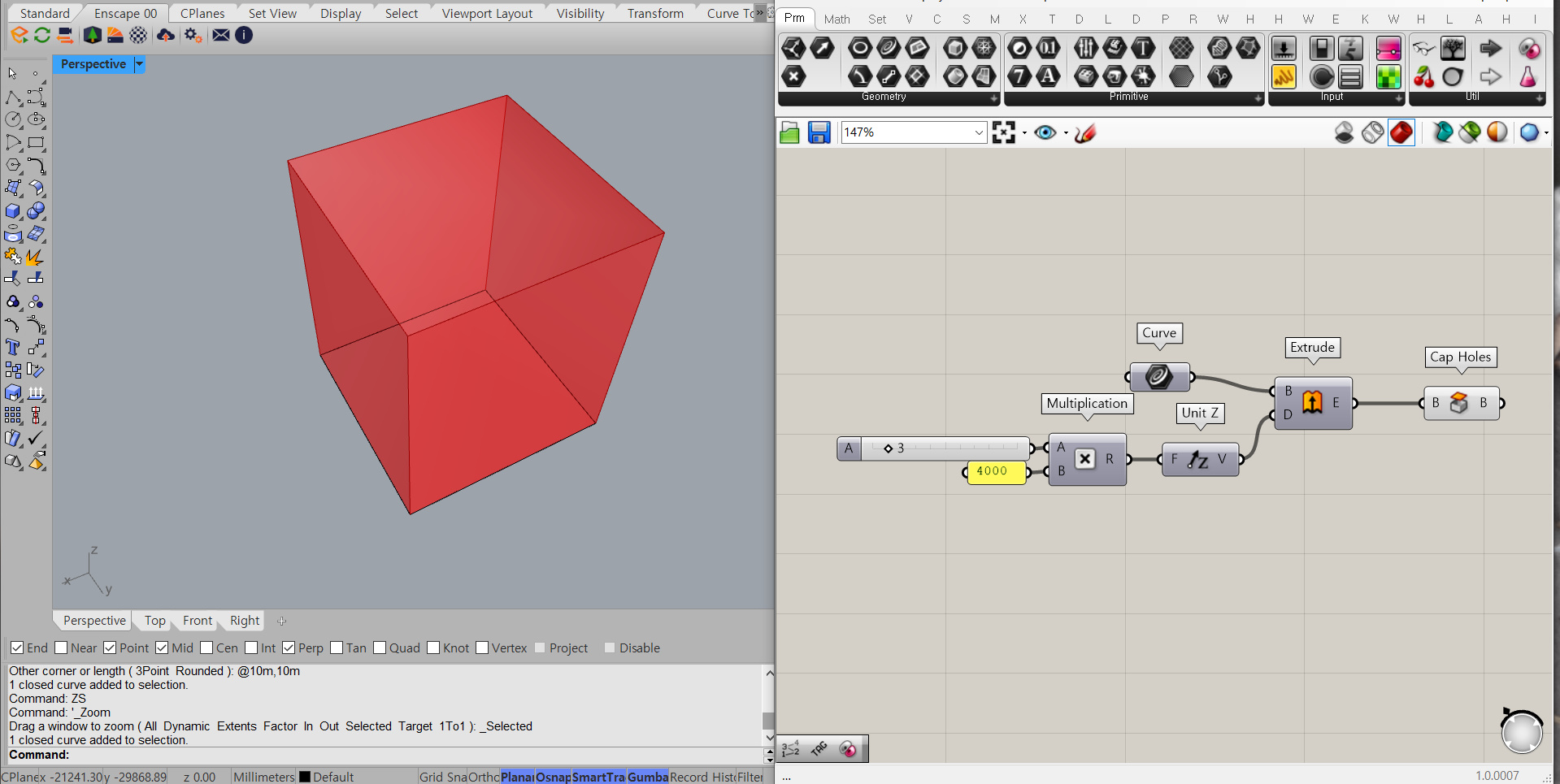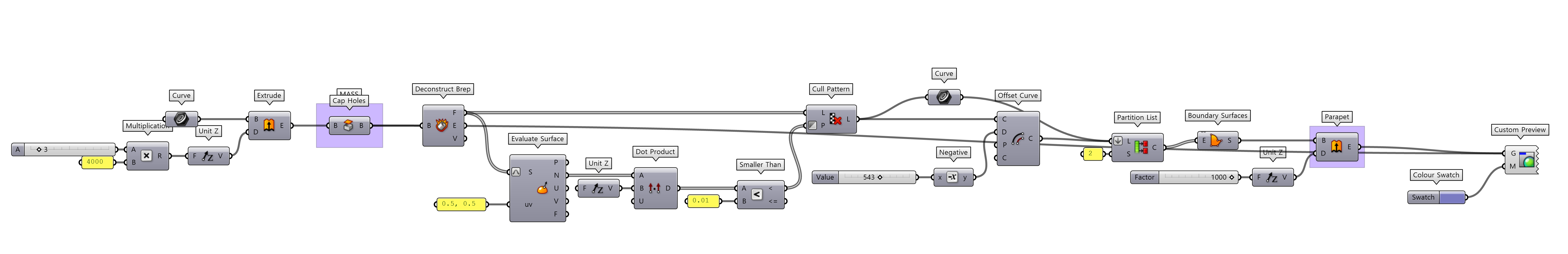 Extrude 컴포넌트를 불러온 뒤 Curve를 연결해줘요. Extrude 컴포넌트는 라이노의 extrude 명령어와 동일한 역할을 해요. D에는 벡터, 즉 방향과 크기를 연결해줘야 해요. 저희는 커브를 통해 건물 매스를 만들 거니 수직으로 그러니까 Z 방향으로 돌출해야 해요. 그러니 D에는 Unit Z 컴포넌트를 연결해요. 얼마만큼 올려줘야 하는지는 건물의 층수에 따라 다르겠죠? Multiplication(곱하기. 간단하게 *로 불러올 수 있어요) 컴포넌트로 (건물의 층수 x 4000)만큼 올릴 수 있도록 해요. 1<20 을 입력하여 1부터 20까지의 범위를 가진 넘버 슬라이더를 불러와서 연결해줘요. A에 연결한 것은 어떻게 보면 건물의 층수라고 할 수 있고, B에 연결한 4000은 건물의 한층당 높이라고 볼 수 있어요. 그렇게 Extrude한 것은 속이 비어 있으니 Cap Holes 컴포넌트로 닫힌 폴리서피스로 만들어 줘요.