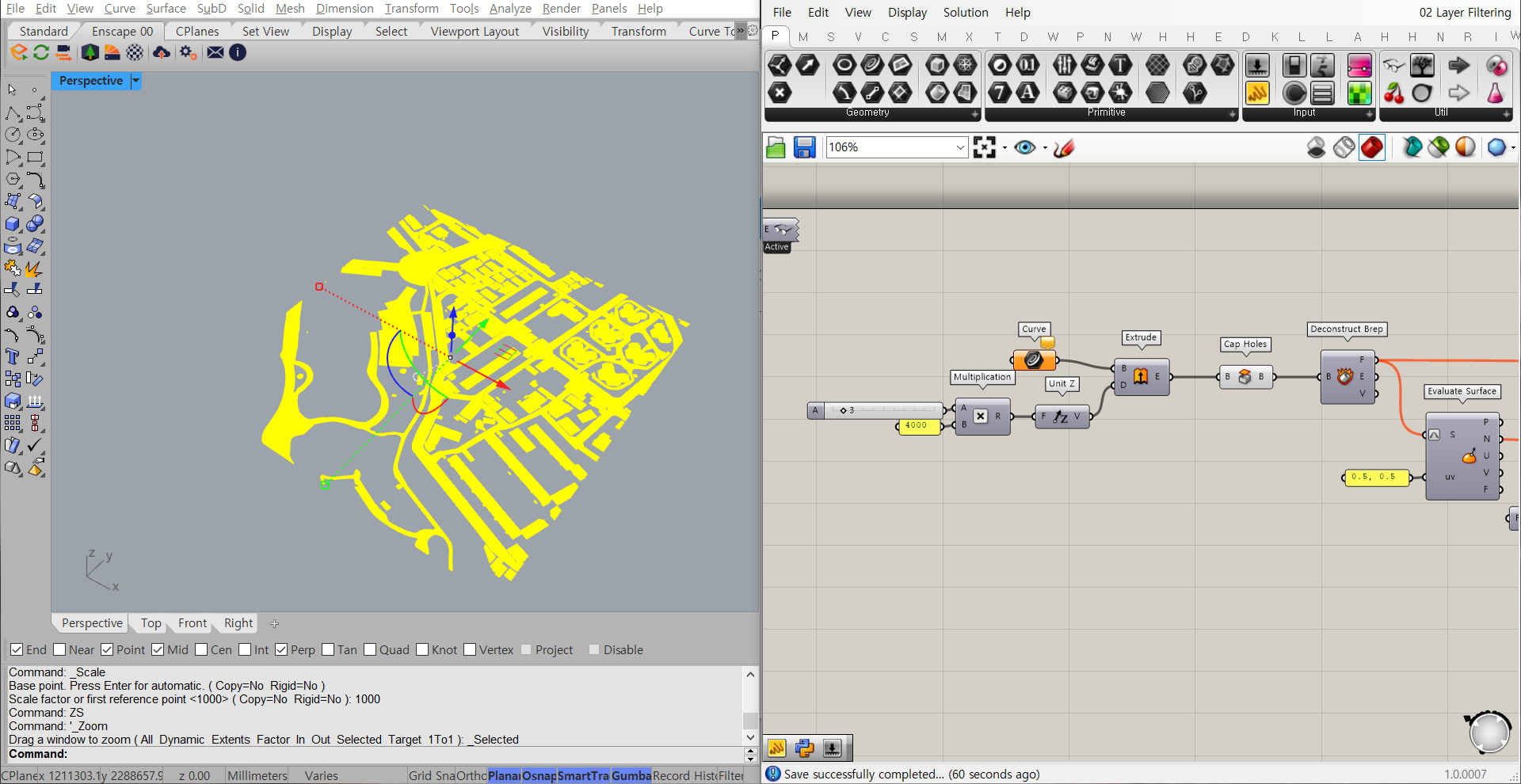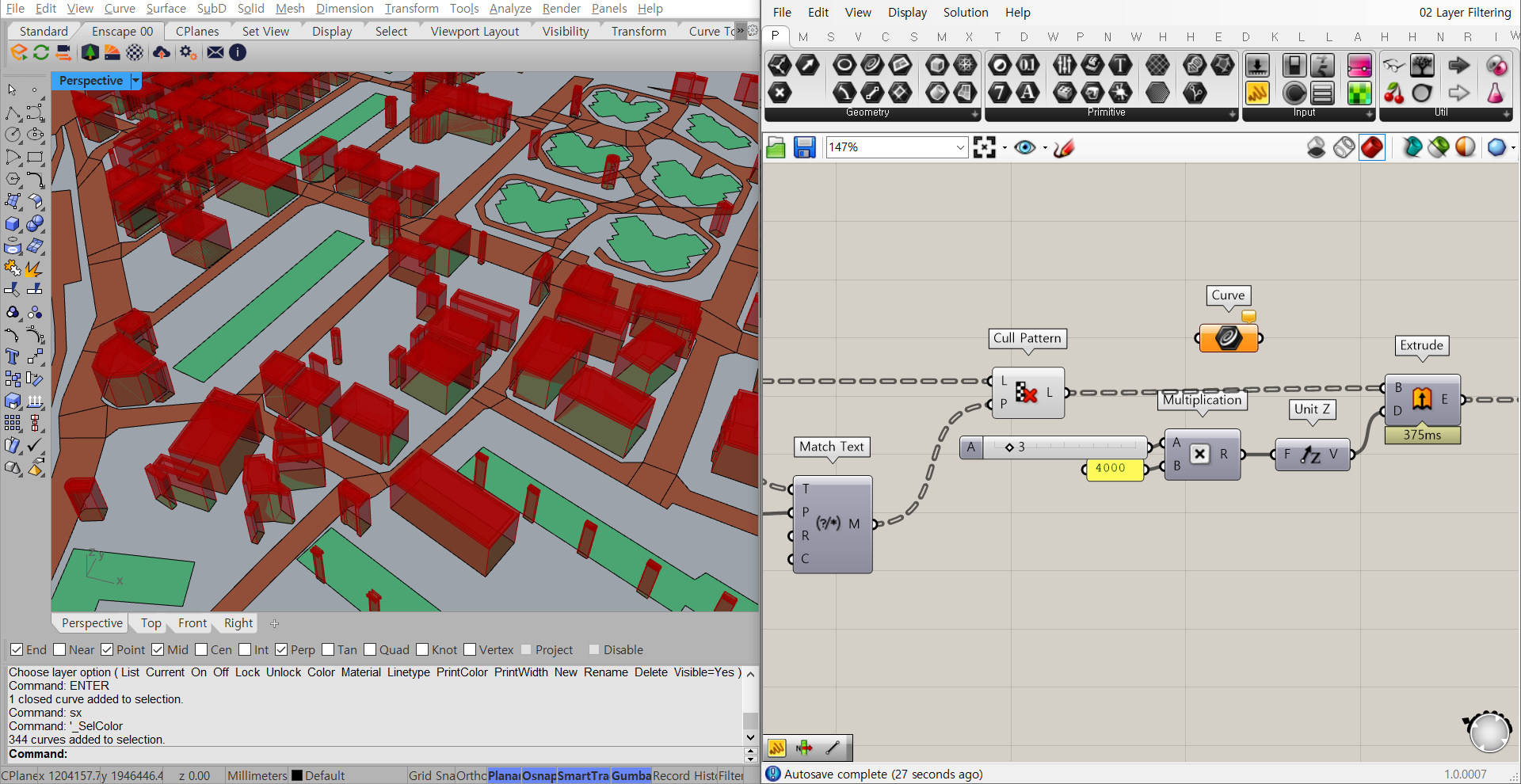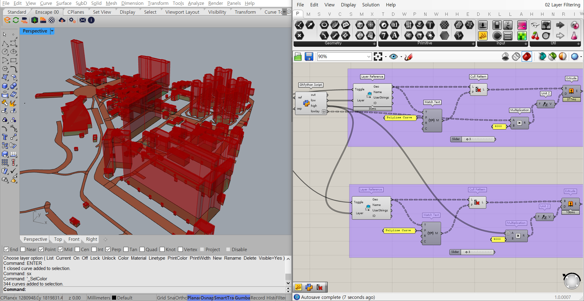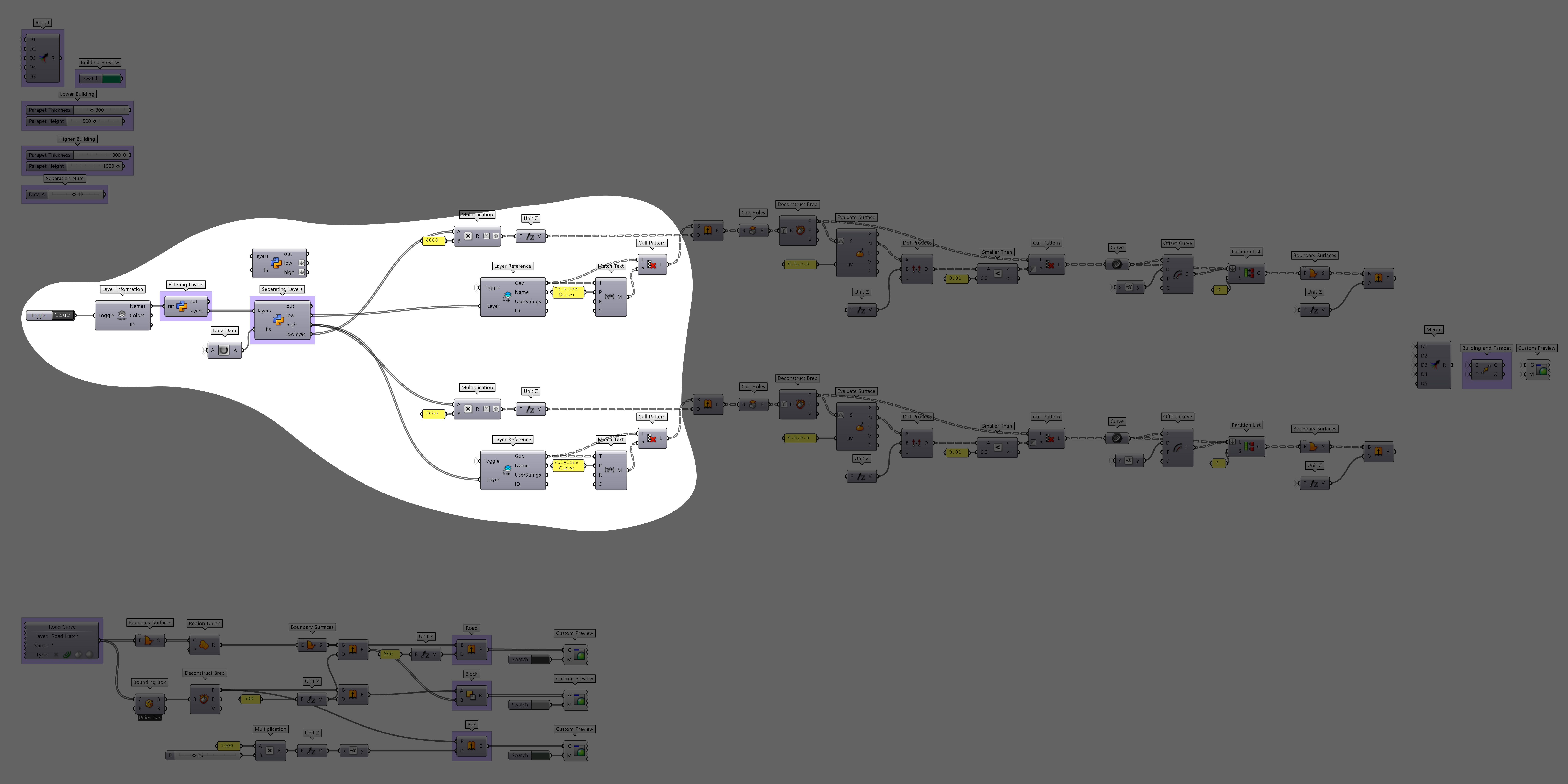 두개로 나눔으로써 offset 오류를 해결하는 것 외에도 다른 장점이 생겼어요. 건물의 층수 정보를 연결해준 Muliplication(곱하기) 컴포넌트에서 B에는 4000을 연결했었어요. 이건 한층당 건물의 높이라고 보면 돼요. 낮은 건물을 더 낮게, 높은 건물을 더 높게 설정하고 싶다면 낮은 건물은 3000으로, 높은 건물은 5000으로 설정하면 돼요. 물론 반대도 가능하고, 세부적인 설정도 가능해요.