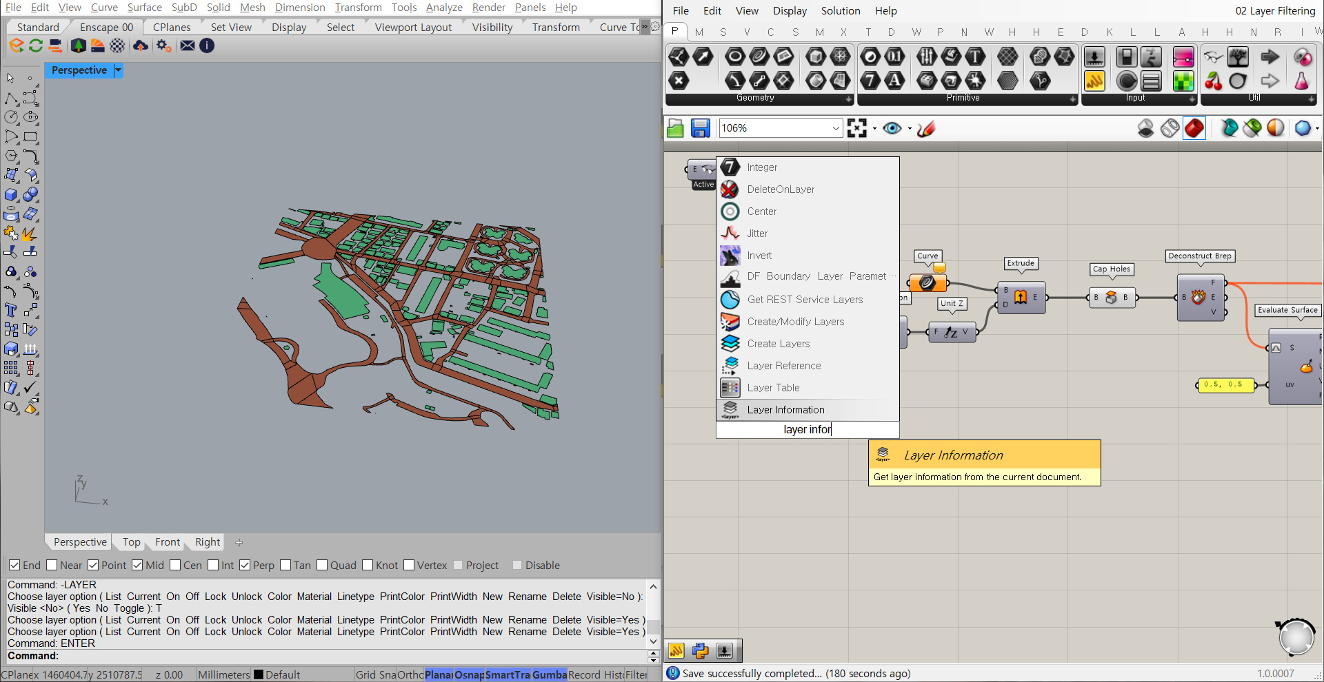 이제 다시 그래스호퍼에서 작업할 거예요. Layer information 컴포넌트를 불러와요. 이 컴포넌트는 런치박스 애드온의 컴포넌트이니 런치박스 설치를 꼭 해줘야 해요.