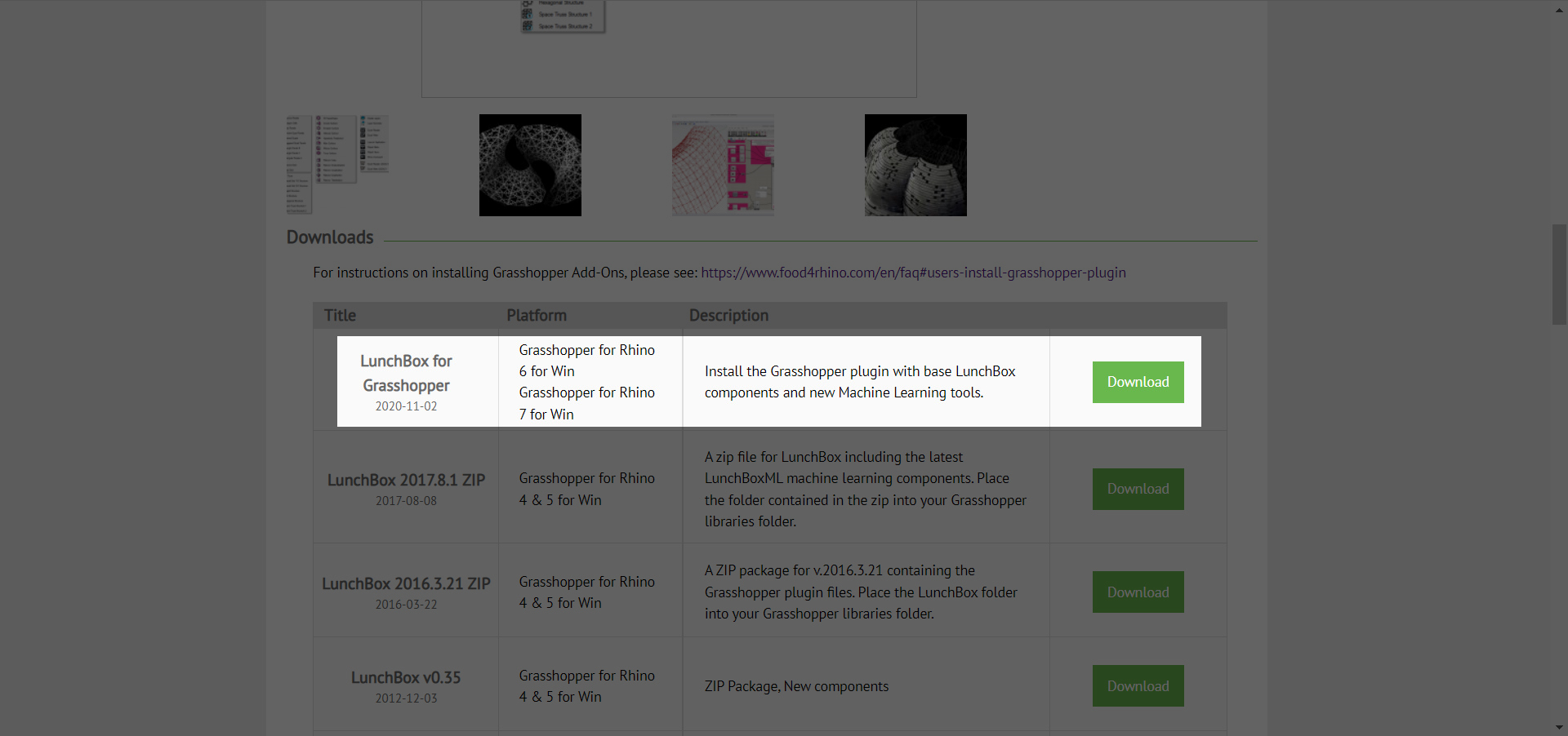 런치박스 애드온은 그래스호퍼에서 가장 많이 쓰이는 애드온 중 하나예요. 저희는 런치박스의 많은 컴포넌트 중 라이노의 레이어와 지오메트리를 불러오는 기능을 하는 LayerReference 컴포넌트와 LayerInformation 컴포넌트를 사용할 거예요. 런치박스 애드온을 설치하기 위해 다음 링크로 접속해주세요. https://www.food4rhino.com/