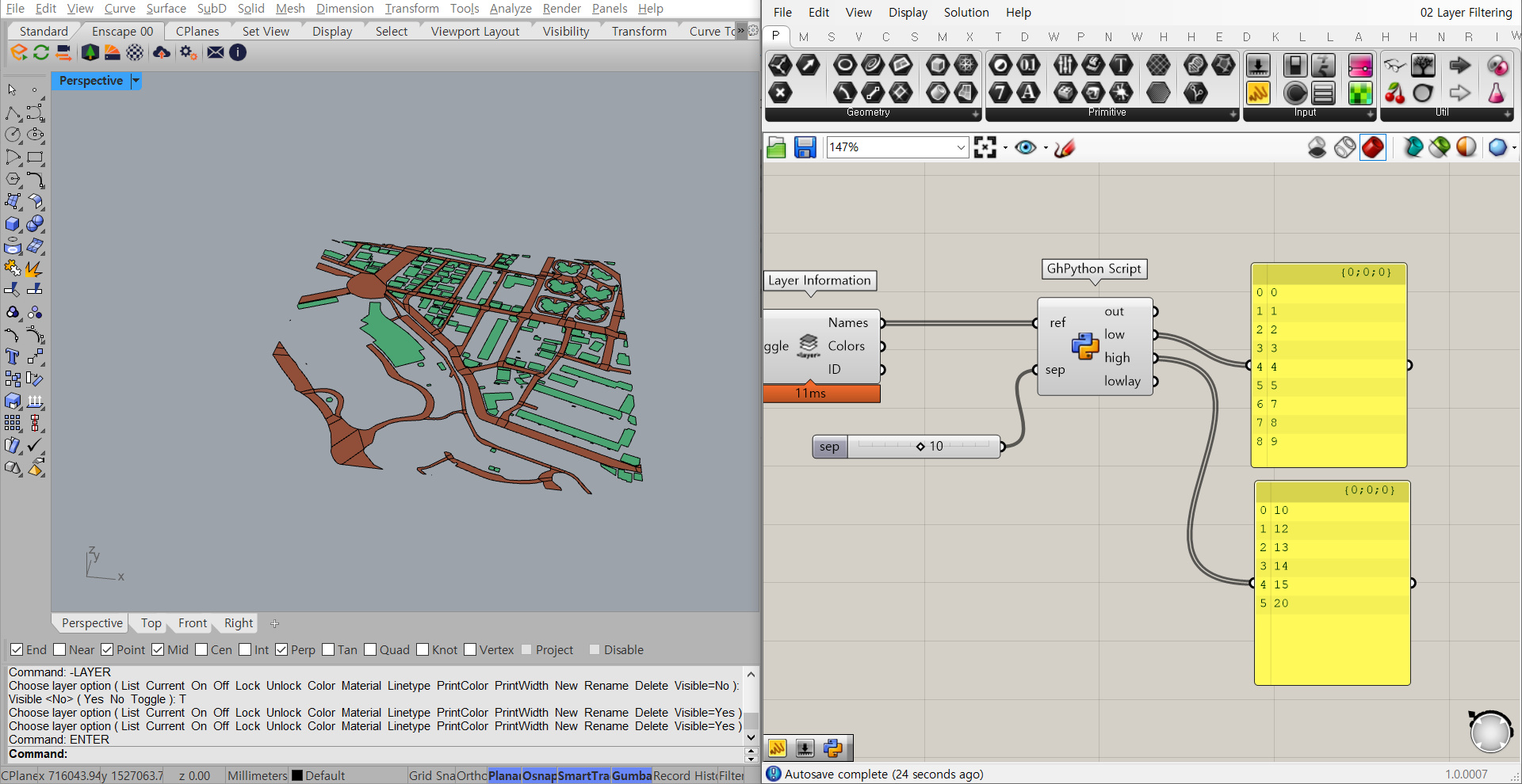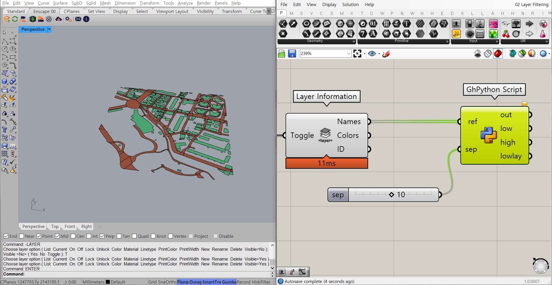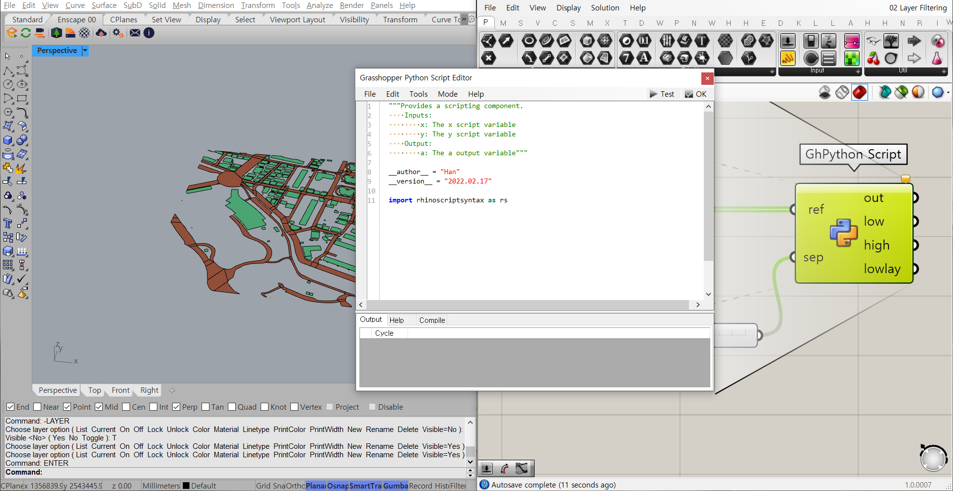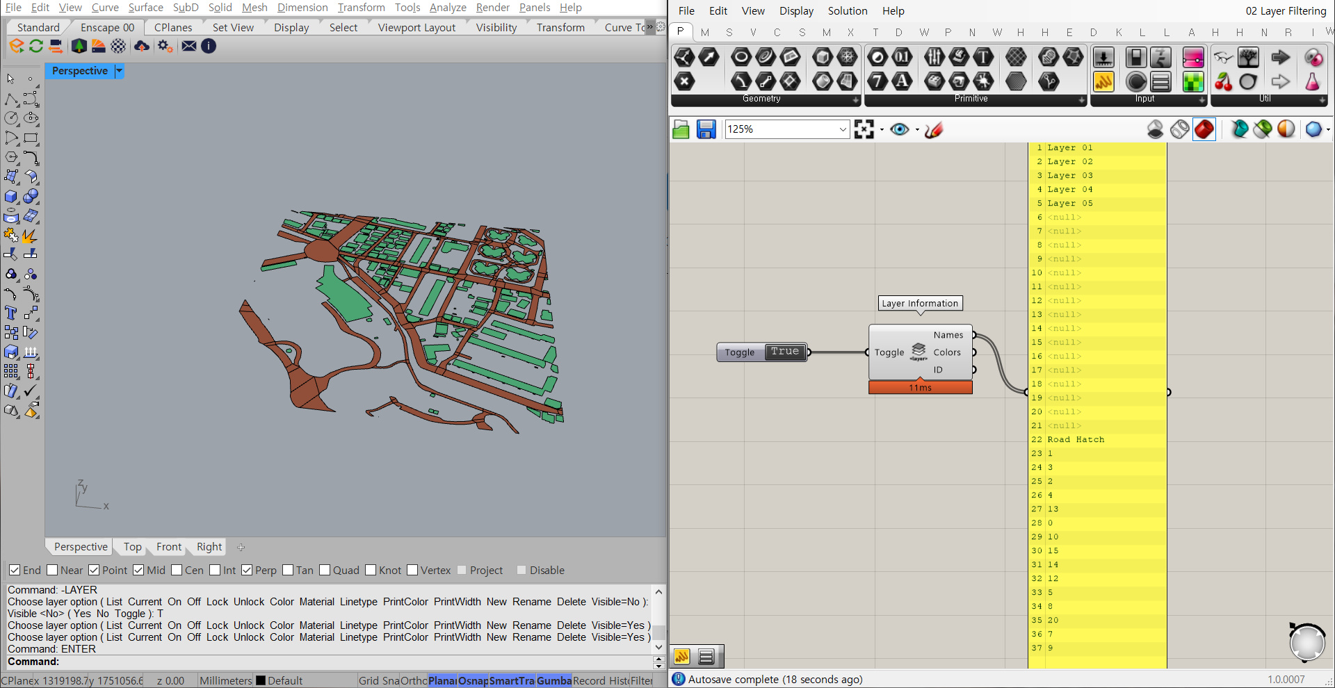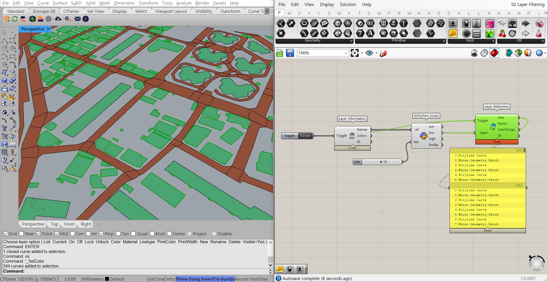 이제 이 레이어 정보를 토대로 각 레이어에 담긴 건물의 커브를 불러올 거예요. Layer Reference 컴포넌트를 불러와요. 그리고 Layer에는 low를 연결해요. Toggle에는 앞에서 불러왔던 Boolean Toggle을 연결해줘요. 그렇게 하고 Layer Reference 컴포넌트를 누르고 라이노를 보면 지오메트리가 레퍼런스 된 걸 볼 수 있어요.