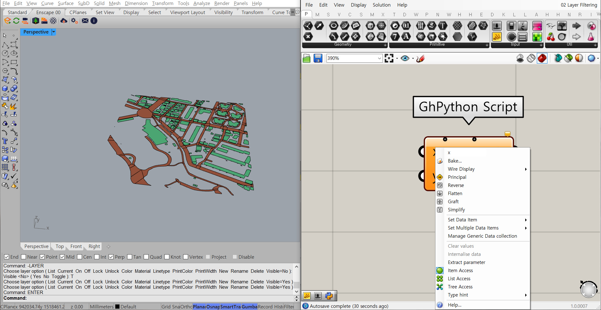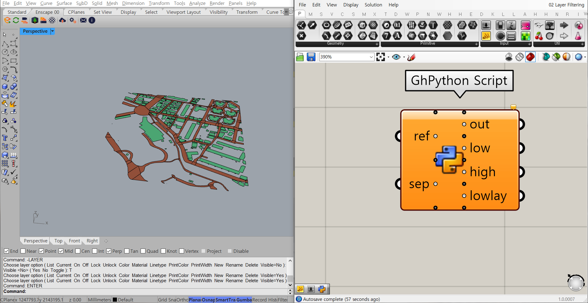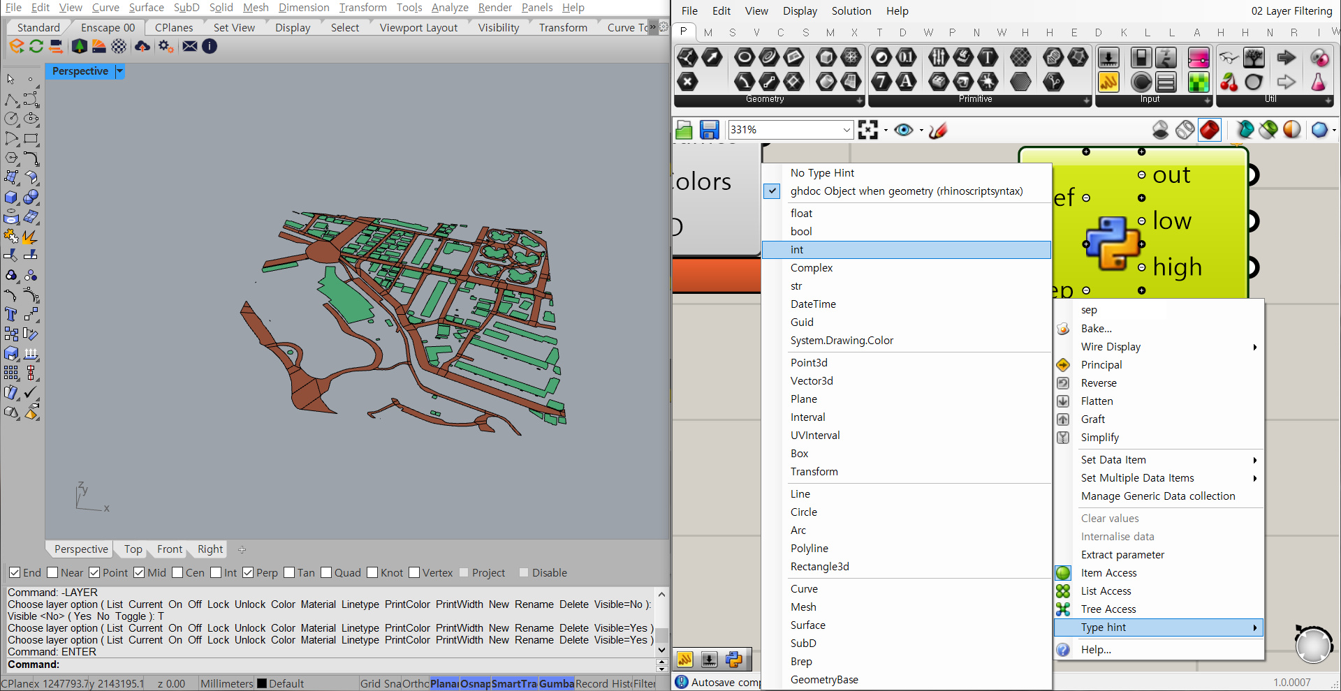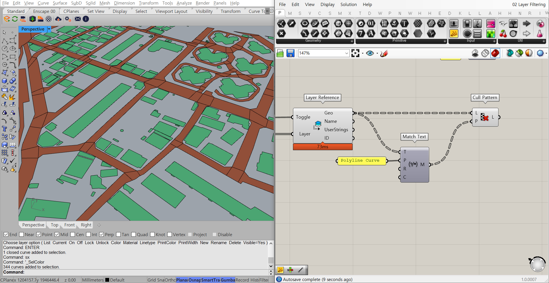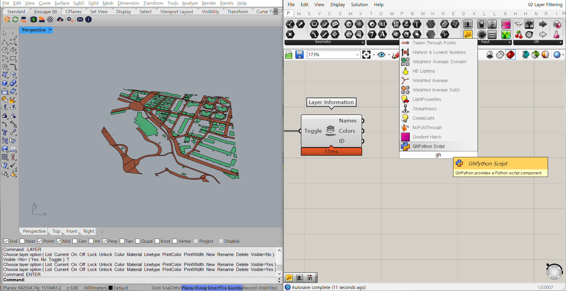 이제 이 레이어 정보를 토대로 각 레이어에 담긴 건물의 커브를 불러올 거예요. Layer Reference 컴포넌트를 불러와요. 그리고 Layer에는 low를 연결해요. Toggle에는 앞에서 불러왔던 Boolean Toggle을 연결해줘요. 그렇게 하고 Layer Reference 컴포넌트를 누르고 라이노를 보면 지오메트리가 레퍼런스 된 걸 볼 수 있어요.