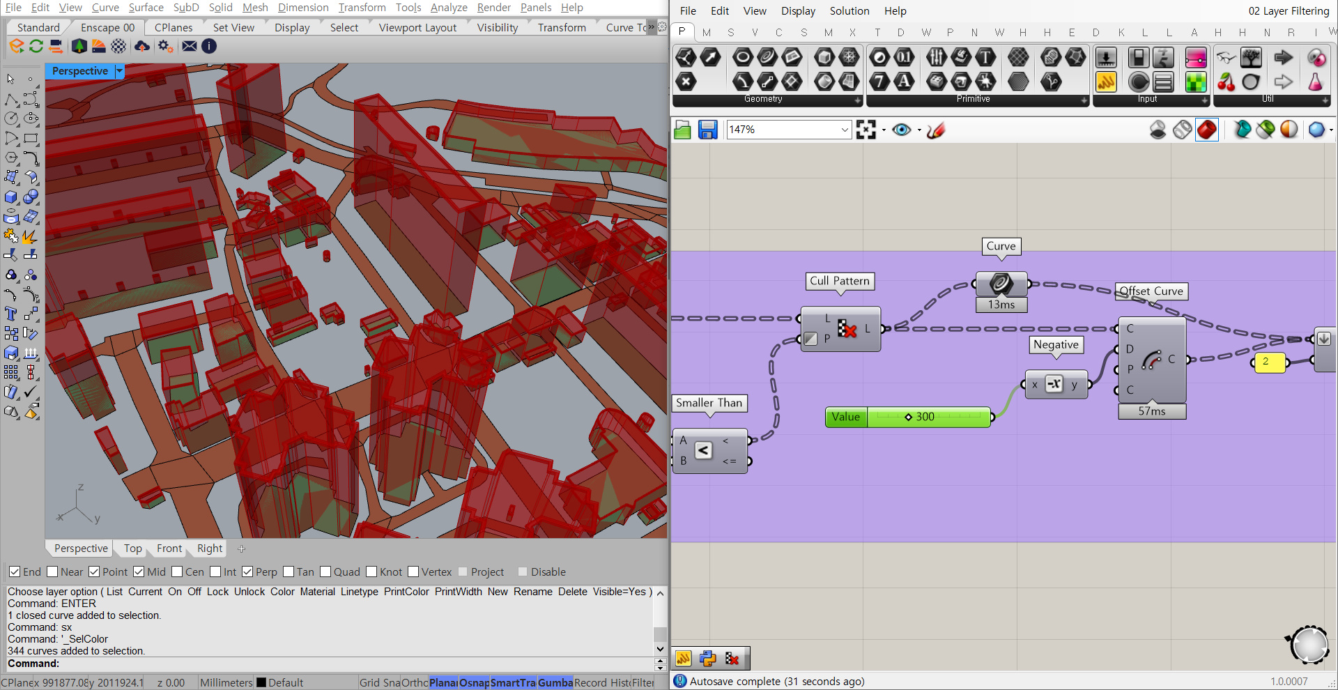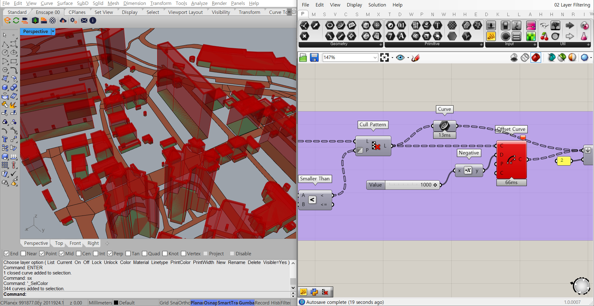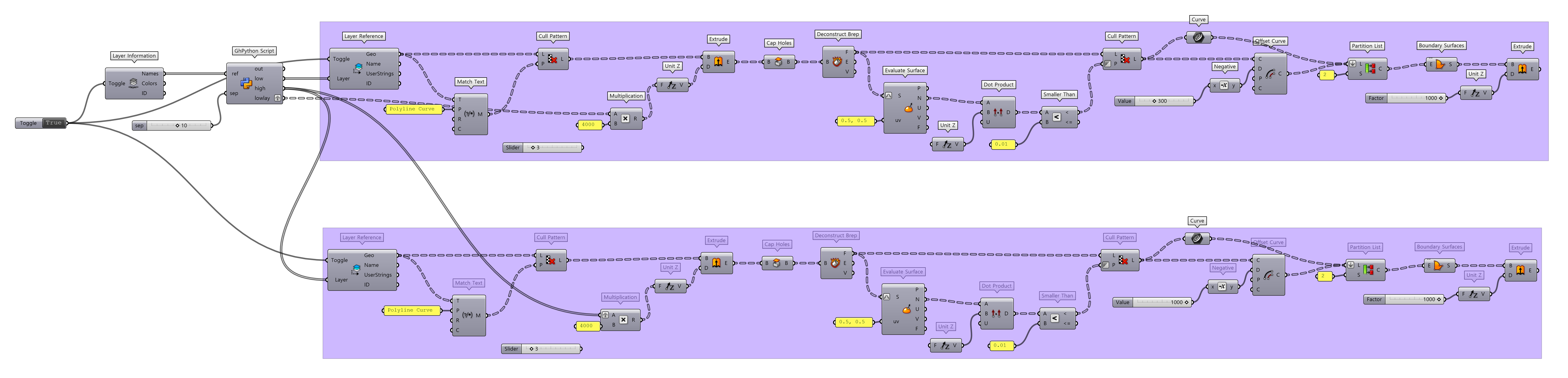 굳이 건물의 층수를 low와 high로 나눈 이유가 있어요. low 코드 부분에서 Offset Curve를 보면 빨간색이 되어 오류가 있음을 알려주고 있어요. 이렇게 오류가 나는 건 커브의 크기가 1000만큼 offset 할만큼 충분히 크지 못하기 때문이에요. 보통 낮은 층수를 가진 건물들은 크기가 작은 경우가 많으니, 그런 건물에 대해선 offset을 적게 해줘야 해요. 참고로 이 offset은 파라펫의 두께를 조절하는 거예요. 제가 첨부해드린 dxf 파일을 기준으로는 300 정도로 설정하면 적당하게 오류가 나지 않아요. 하지만 다른 지역의 건물들에 대해서는 1000만큼 offset을 해도 오류가 나지 않을 수도 있고, 300을 해도 오류가 날 수 있으니 적절히 조절해서 사용하면 돼요.
