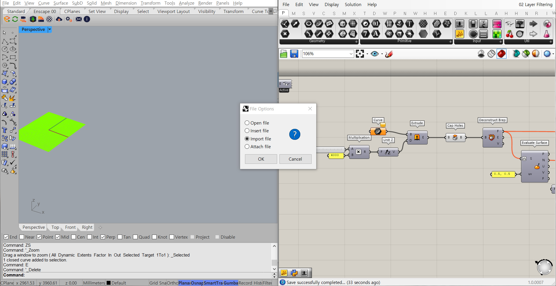 저는 라이노의 Unit(단위)이 밀리미터 단위예요. 이 코드는 밀리미터 단위를 기준으로 작성되고 있으니 참고해주세요. import를 누르면 이런 설정이 뜨는데 저는 따로 만지지 않고 바로 OK를 눌렀어요.