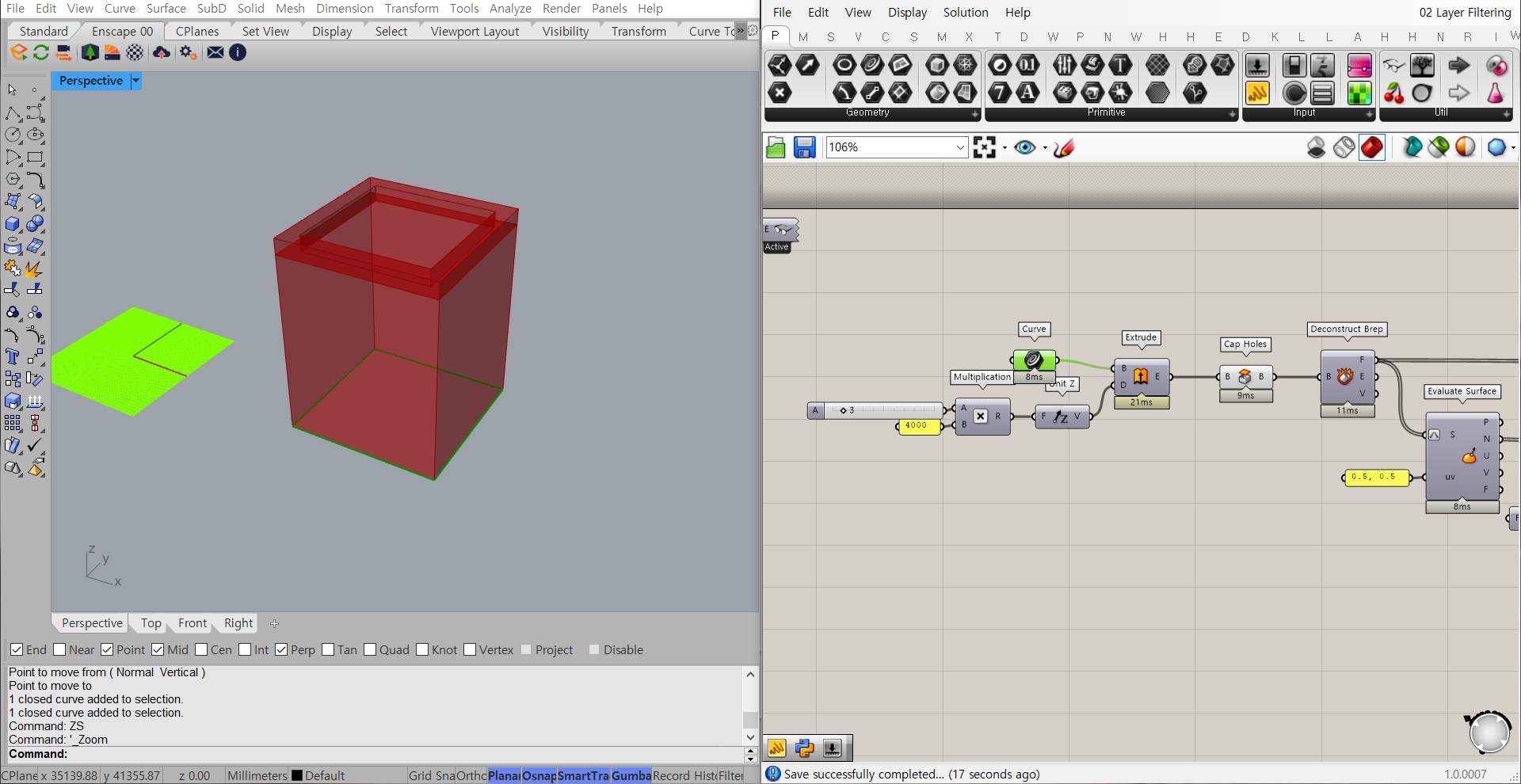 앞에 있는 파이썬 컴포넌트에서 lowlay 부분을 이전에 작성했던 코드에 있는 Multiplication(곱하기) 컴포넌트의 A에 연결해줘요. 이때 lowlay를 우클릭 하여 Graft를 해줘야 해요. 이제 다 했어요. 남은 일은 복사 붙여넣기예요.