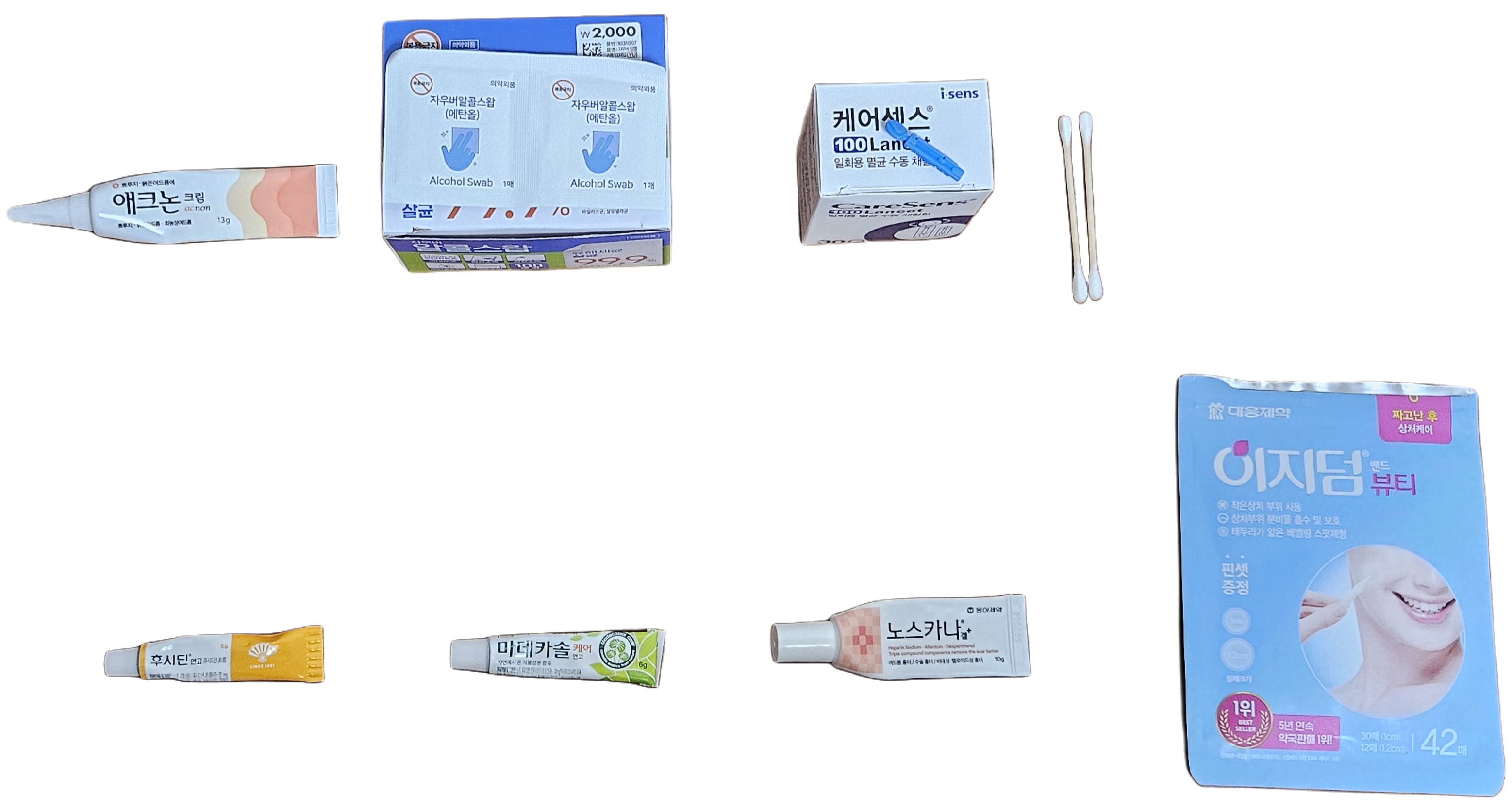 여드름을 짤 때 필요한 제품들입니다. 애크논, 알코올솜, 란셋, 면봉, 후시딘, 마데카솔, 노스카나, 습윤밴드 입니다. 전부 다 약국에서 구할 수 있고 저는 알코올솜과 면봉은 다이소에서 샀습니다.