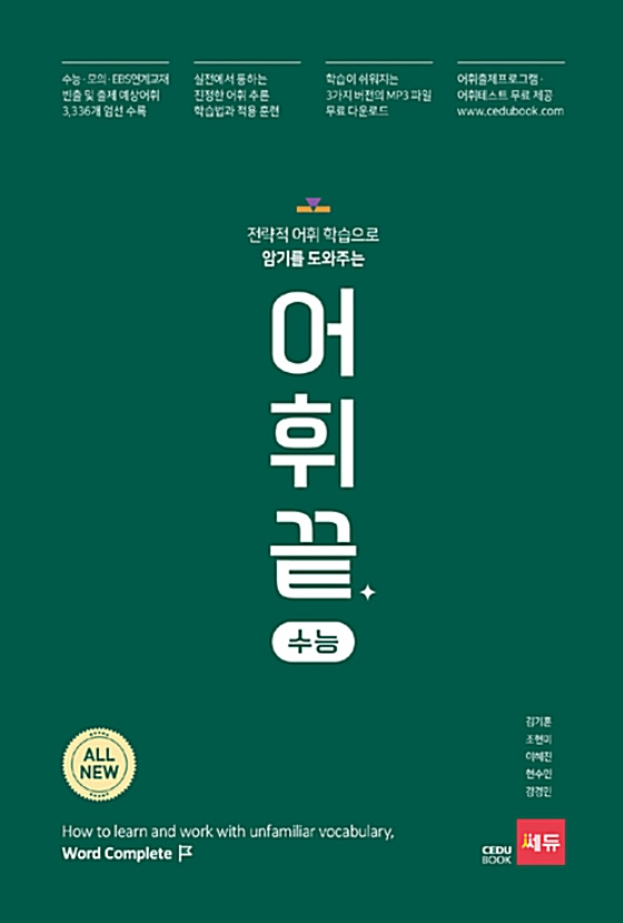 어휘끝 하면 쓸데없이 어려운 단어들을 많이 모아놓은 두꺼운 단어장이 떠오르는 분들이 계실 수 있습니다. 그런 생각은 어휘끝 5.0이라는 다른 단어장만 있던 때에 생겼을 수 있습니다. 어휘끝 5.0은 수능 뿐만 아니라 토플, 텝스 등 다른 시험들까지 모두 아우르는 어휘력을 기르기 위해 집필된 단어장입니다. 하지만 어휘끝 수능은 다릅니다. 이름에서 알 수 있듯이 수능에 특화된 단어들만을 모아놓았습니다. 어휘끝 수능은 유명한 수능 영어 강사인 김기훈 강사가 집필한 책입니다.