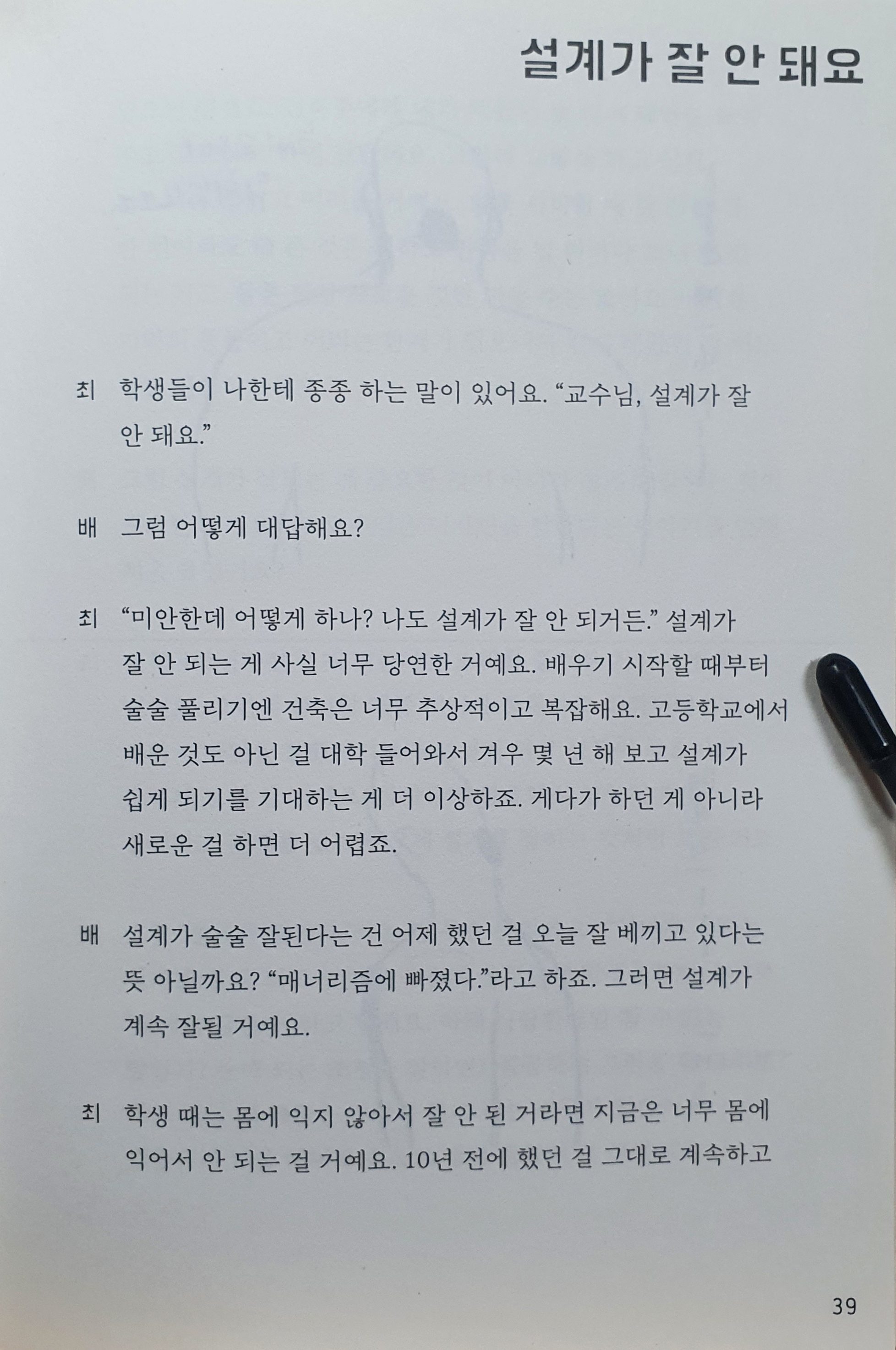 개인적으로 흥미로웠던 주제입니다. “설계가 잘 안 돼요” 모든 건축학부생들이 공감할 것이라 생각합니다. 그래서 다들 관심을 가지고 읽을 수 있을 것이라 생각합니다. 내용을 보면 건축에 조예가 깊고 오래 종사한 두 분조차도 설계가 잘 안 된다고 하시는 걸 보니 조금이나마 위안이 되었습니다. 교수기도 한 두 분이 설계를 어렵다고 하시는 걸 보니, 저희 과 담당 교수님들도 같은 생각을 하실까 하는 생각이 들기도 했습니다.
